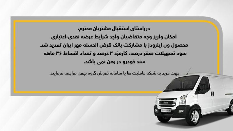 با صدور این بخشنامه زمان تکمیل وجه ون باری اینرودز از سوی بهمن موتور که با مشارکت بانک قرضالحسنه ایران انجام میشود، تا ساعت 24 روز دوشنبه 16 مهرماه جاری اعلام شده است.