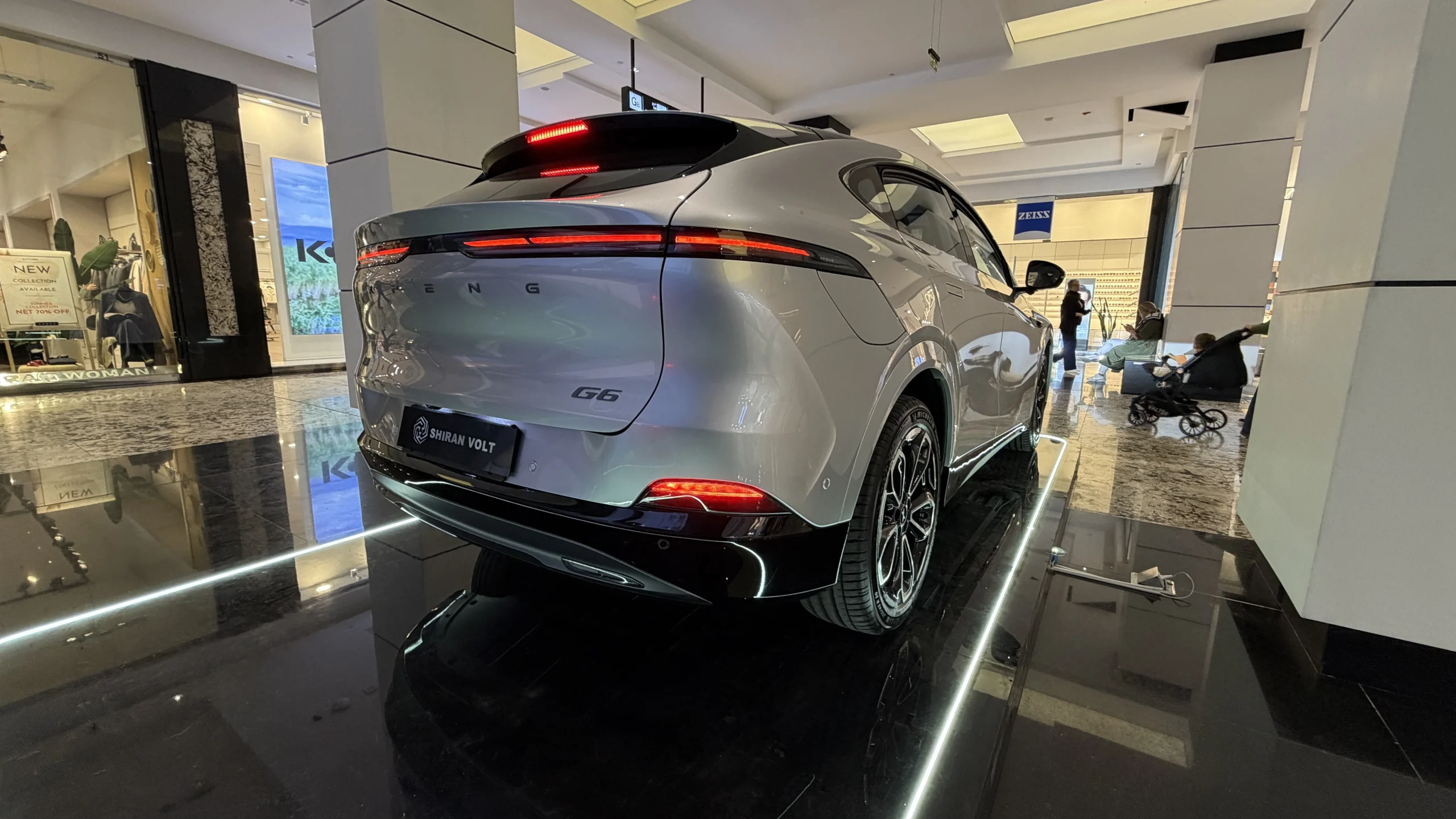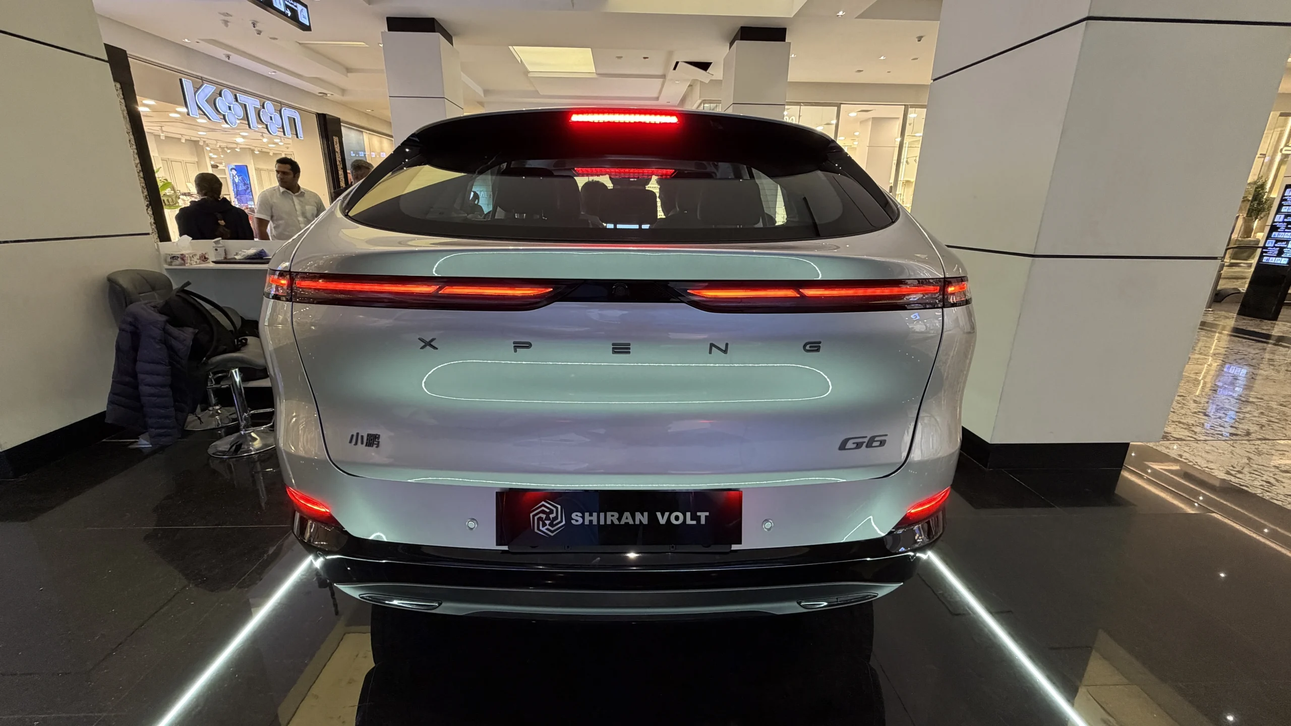 بدنه فستبک G6 با سقفی یکدست و شیبدار که در انتها به اسپویلری ظریف منتهی میشود، افزون بر افزایش جذابیت ظاهری، ضریب درگ را به حدود ۰٫۲۶ Cd کاهش داده است. رینگهای آلیاژی ۲۰ اینچی، دستگیرههای مخفی درِها و خطوط جانبی پیوسته، بر پویایی ظاهری خودرو افزودهاند. در عقب نیز چراغهای LED سرتاسری، نشان XPENG در مرکز، و سپری اسپرت، جلوهای مدرن و هماهنگ به خودرو بخشیده است.