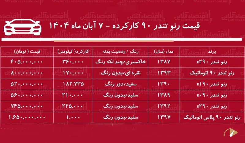 در جدیدترین بررسی بازار خودروهای کارکرده، قیمت مدلهای مختلف رنو تندر ۹۰ با توجه به سال ساخت و میزان کارکرد اعلام شد. بر اساس آگهیهای منتشرشده، رنو تندر ۹۰ E2 مدل ۱۳۸۷ با کارکرد ۳۶۰ هزار کیلومتر و چند لکه رنگ، قیمتی در حدود ۴۰۵ میلیون تومان دارد. این مدل با وجود عمر بالا، همچنان بهدلیل دوام فنی بالا مشتریان خاص خود را حفظ کرده است.