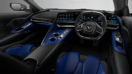 داخل کابین نیز با همان دقت و ظرافت طراحی شده است. ترکیب چرم ناپا به رنگهای Jet Black و Santorini Blue، همراه با صندلیهای مسابقهای موسوم به Competition Seats و کمربندهای ایمنی آبی، جلوهای لوکس و اسپرت ایجاد کرده است. رکابهای درها بازطراحی شده و جزئیات گستردهای از فیبر کربن در سراسر کابین به کار رفته تا حس رانندگی با یک خودروی مسابقهای واقعی منتقل شود.