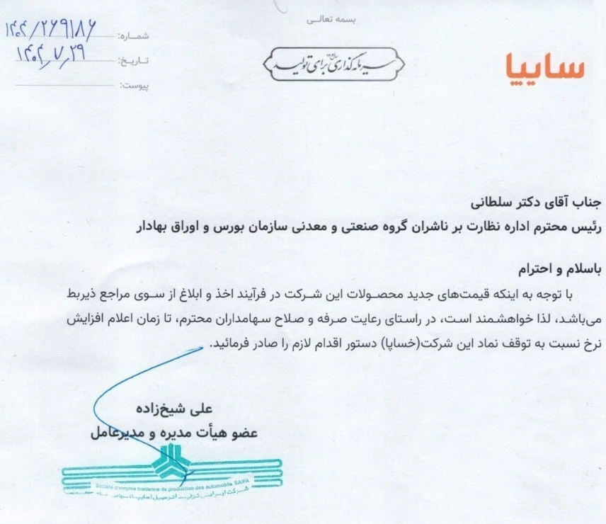 شرکت سایپا در نامه به اداره نظارت بر ناشران صنعتی سازمان بورس اعلام کرد با توجه به اینکه قیمتهای جدید محصولات شرکت سایپا در فرایند اخذ و ابلاغ از سوی مراجع ذیربط میباشد، لذا خواهشمند است، در راستای رعایت صرفه و صلاح سهامداران، تا زمان اعلام افزایش نرخ نسبت به توقف نماد این شرکت (خساپا) دستور اقدام لازم را صادر فرمائید.