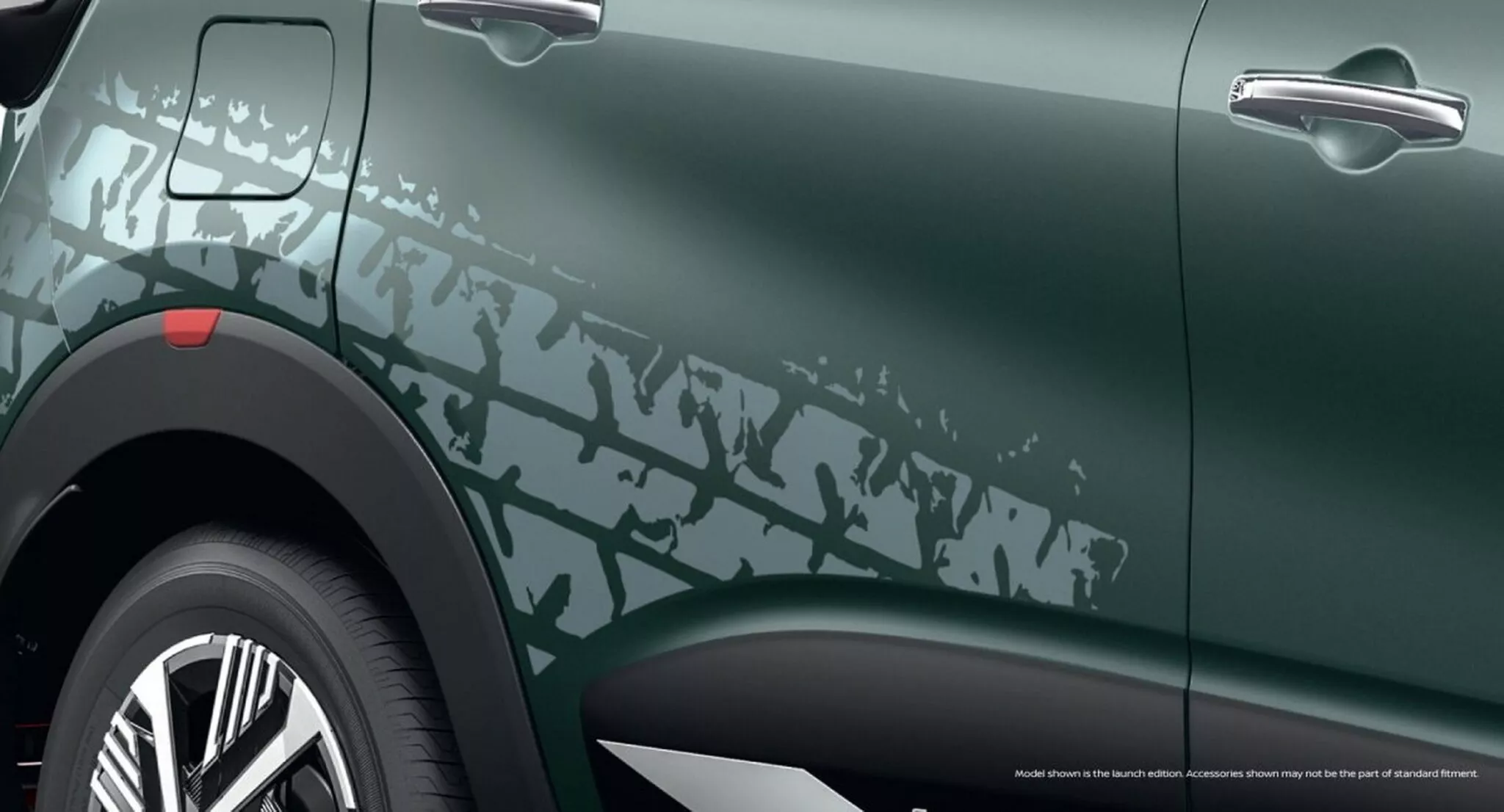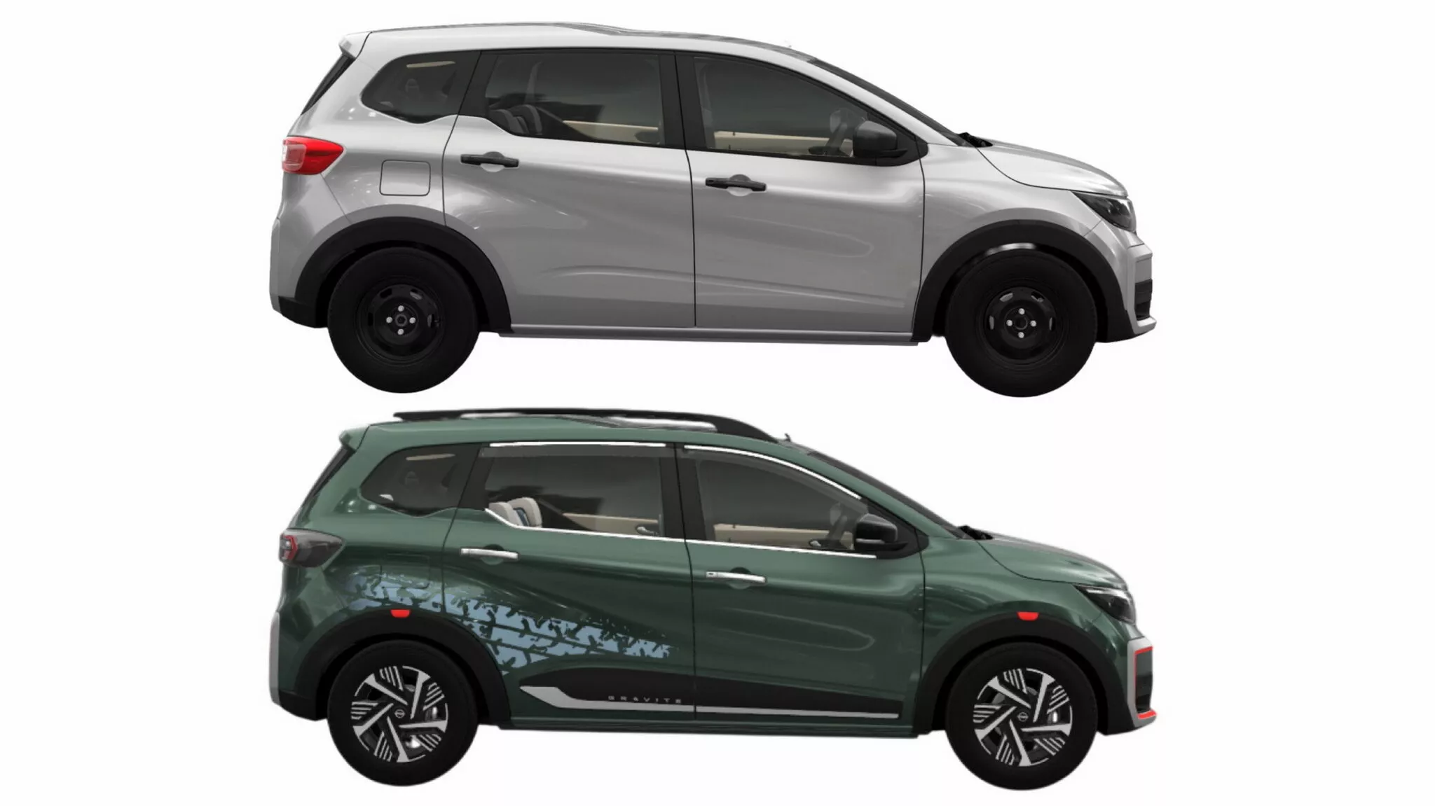 از نمای جانبی، طراحی بدنه تقریباً مشابه رنو تریبر است و تفاوت اصلی به رینگ‌های آلیاژی جدید و طیف رنگی متنوع محدود می‌شود؛ از جمله رنگ سبز Forest Green که از نیسان پاترول الهام گرفته شده است. در عقب، سپر با جزئیات خشن‌تر و درج نام گراویت روی در صندوق، هویت خودرو را نشان می‌دهد. نسخه‌ای که در تصاویر منتشر شده دیده می‌شود با نام Launch Edition است که تولید آن محدود به ۱۰۰۱ دستگاه است و با تزئینات نارنجی و برچسب‌های اختصاصی از دیگر مدل‌ها متمایز می‌شود.