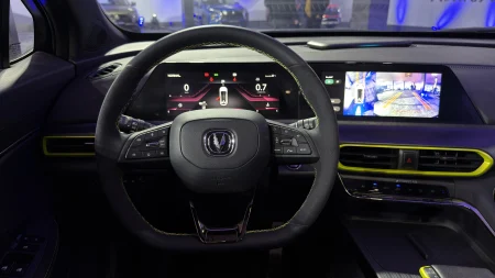 با ورود به کابین UNI‑T، فضایی مدرن و فناوریمحور پیش روی سرنشینان قرار میگیرد. داشبورد میزبان مجموعهای از نمایشگرهای دیجیتال یکپارچه است که بخش عمدهای از سطح آن را پوشش داده و با حذف اغلب دکمههای فیزیکی، طراحی مینیمال و امروزی را به نمایش میگذارد. استفاده از شیفتر الکترونیکی نیز کنسول میانی را سادهتر و کاربردیتر کرده است. صندلیها با روکش چرمی باکیفیت طراحی شدهاند و صندلی راننده از تنظیمات برقی بهره میبرد.