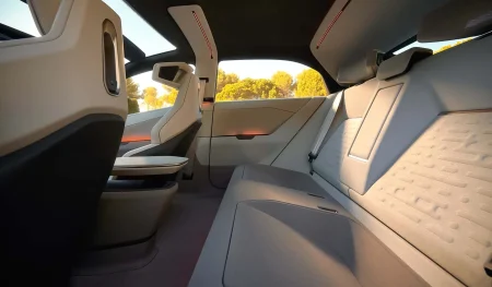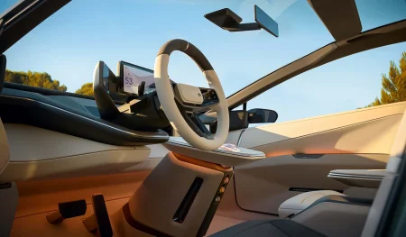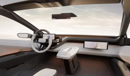 فضای داخلی نیز بازطراحی کاملی را تجربه کرده و در راستای رویکرد آیندهنگرانه بدنه شکل گرفته است. داشبورد با فرم مینیمال طراحی شده و دو نمایشگر مجزا شامل صفحهنمایش دیجیتال برای راننده و نمایشگر اختصاصی برای سرنشین جلو دارد. کنسولی شناور در میانه کابین قرار گرفته که اهرم تعویض دنده آن از ساختار کلی بدنه الهام گرفته است. صندلیها فرم ارگونومیک و مدرن دارند و نورپردازی محیطی، فضایی پیشرفته و آرامشبخش ایجاد میکند. کنترلهای مربوط به سیستم چندرسانهای و تهویه نیز بر روی فرمان و دو سوی نمایشگر مرکزی نصب شدهاند.