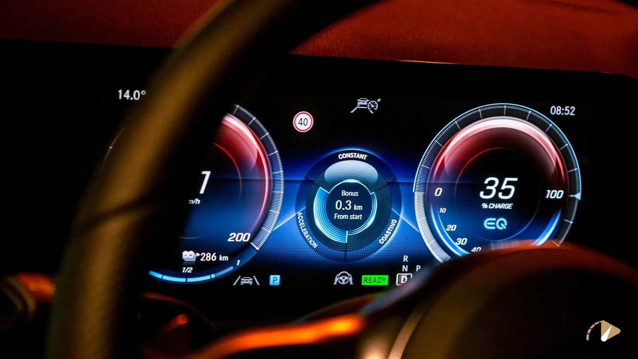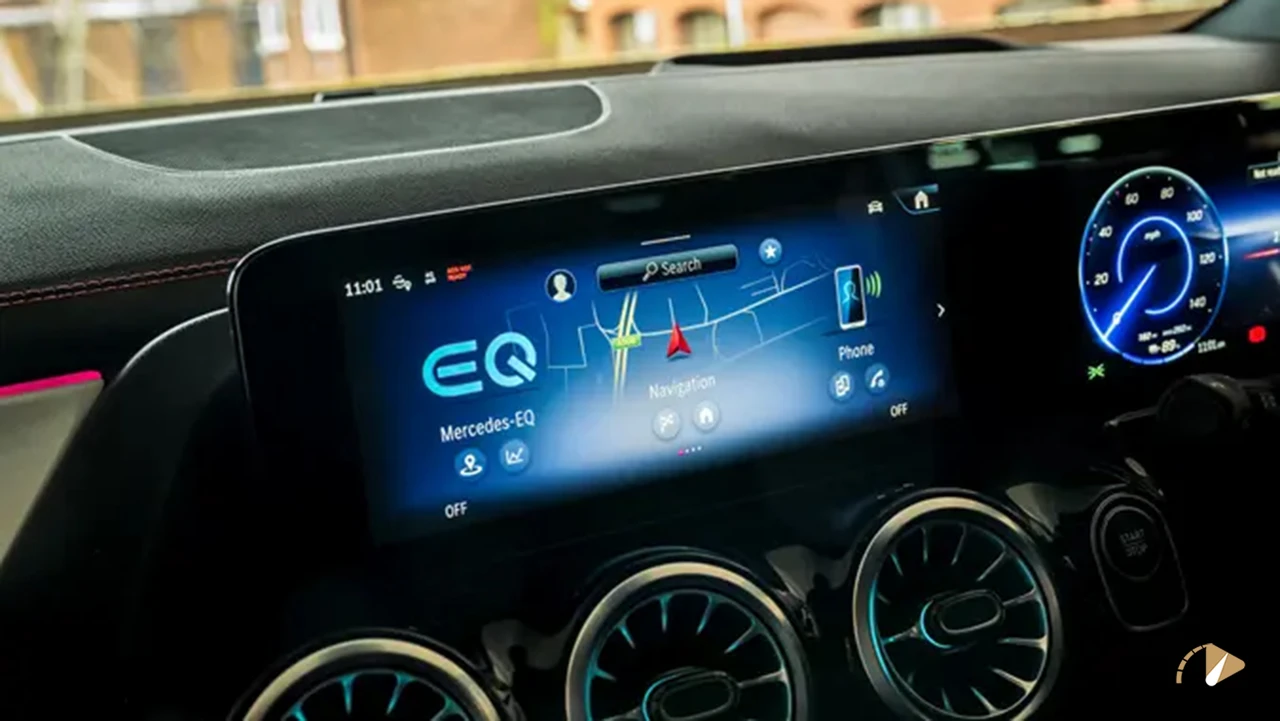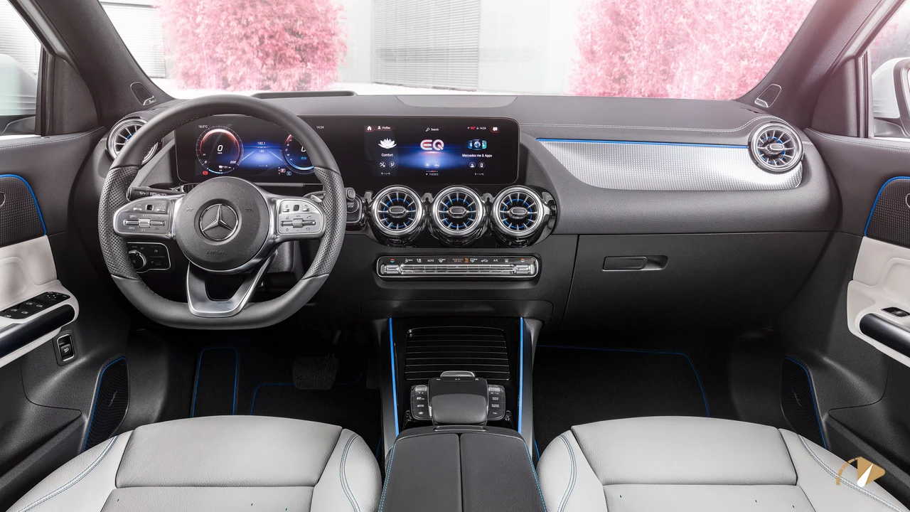با این حال، طراحی داشبورد شباهت زیادی به مدلهای بنزینی مانند GLA دارد و ممکن است برای برخی کاربران، نوآوری کمتری نسبت به مدلهای بالاتر EQ احساس شود. کنسول مرکزی با جابجایی دسته دنده به پشت فرمان، فضای بیشتری برای محفظههای ذخیرهسازی فراهم کرده است.