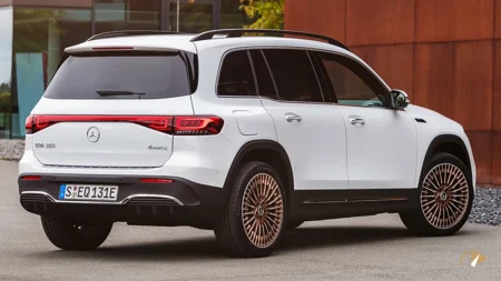 نمای بیرونی EQB ترکیبی هوشمندانه از زبان طراحی خانوادهٔ EQ و تناسبات آشنای GLB است. جلوپنجرهٔ بستهٔ مشکی براق (Black Panel) با لوگوی بزرگ مرسدس و نوار LED افقی بین چراغها، هویت تمامبرقی خودرو را بهسرعت آشکار میکند. چراغهای اصلی LED چندبخشی با فناوری Digital Light و گرافیک داخلی مدرن، همراه با سپرهای ساده و ورودیهای هوای فعال، ظاهری مینیمال اما لوکس خلق کردهاند.