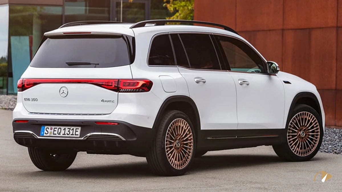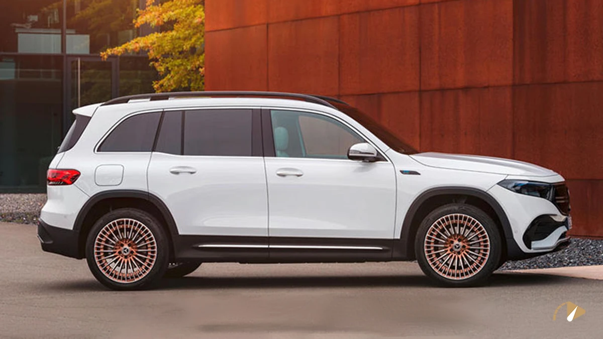 در نمای جانبی، خطوط تمیز بدنه، دستگیرههای همسطح درها و رینگهای ۱۸ یا ۱۹ اینچی آیرودینامیک، ضریب درگ پایین را نشان میدهند. سقف کشیده و ریلهای سقفی نقرهایرنگ، کاربری خانوادگی را تقویت میکنند. در عقب، چراغهای باریک سرتاسری LED با نوار نوری یکپارچه و دیفیوزر ساده، امضای بصری جدید محصولات برقی مرسدس را تکمیل میکنند. ابعاد بدنه ۴۶۸۴ میلیمتر طول، ۱۸۳۴ میلیمتر عرض، ۱۶۹۳ میلیمتر ارتفاع و فاصلهٔ محوری ۲۸۲۹ میلیمتر، ترکیبی مناسب از فضای داخلی جادار و مانورپذیری شهری ارائه میدهد.