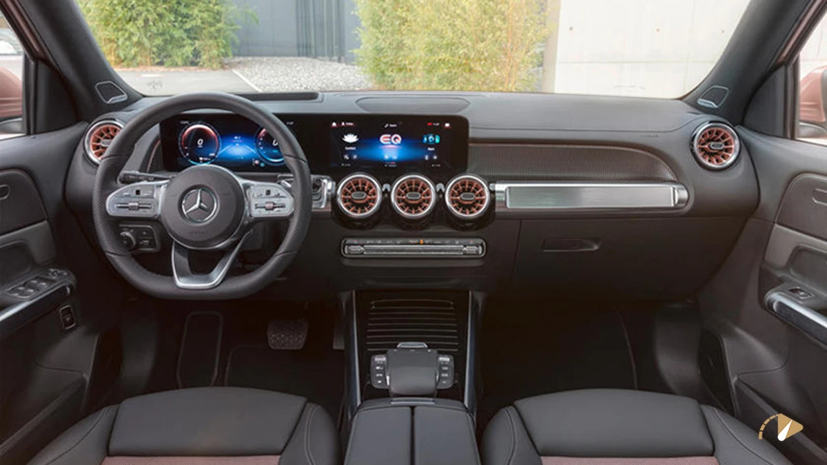کابین EQB ترکیبی از مینیمالیسم مدرن و لوکسگرایی سنتی مرسدس است. دو نمایشگر ۱۰.۲۵ اینچی پیوسته (پشت آمپر دیجیتال و سیستم مرکزی MBUX) با گرافیک شفاف و سرعت پاسخگویی بالا، محور اصلی داشبورد هستند. دریچههای تهویهٔ گرد توربینی، تریم آلومینیومی یا طرح چوب و نورپردازی محیطی ۶۴ رنگ، حس پریمیوم را حفظ کردهاند. متریال بهکاررفته شامل چرم Artico و سطوح نرم لمسی است و کیفیت مونتاژ در سطح استاندارد مرسدس قرار دارد.