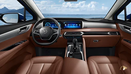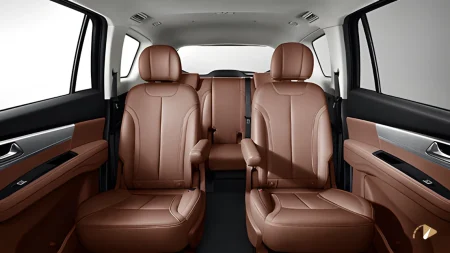فضای داخلی جادار است و ردیف سوم صندلیهای نیمکتی برای دو نفر مناسب به نظر میرسد، هرچند تنظیمات عرضی در ردیف دوم وجود ندارد. دوربین سقفی برای نظارت بر سرنشینان عقب، ویژگی مفیدی برای والدین است. متریال کابین متوسط است و ترکیبی از پلاستیک و چرم مصنوعی، کیفیت قابل قبولی ارائه میدهد، اما در مقایسه با رقبای لوکستر، ممکن است احساس اقتصادی بودن ایجاد کند. تریم دو رنگ و پنلهای سقفی، روشنایی و راحتی را افزایش میدهند.