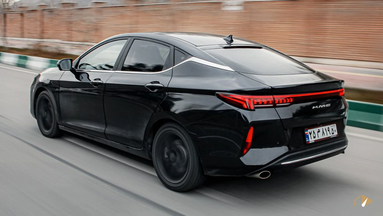 نمای عقب شامل چراغهای بههمپیوسته LED با گرافیک خاص، دیفیوزر و اگزوزهای کرومی دوگانه است که جنبه اسپرت را تقویت میکند. کیفیت کروم اگزوزها متوسط است و ممکن است با گذشت زمان تغییر رنگ دهد. بدنه کشیده با خطوط تیز، ظاهری عضلانی ارائه میدهد. کیفیت رنگ بدنه قابل قبول گزارش شده، اما نیاز به مراقبت دارد. این طراحی در مقایسه با سدانهای سنتی بازار ایران، تمایز ایجاد میکند، هرچند برخی جزئیات مانند اندازه جلوپنجره ممکن است سلیقهای باشد.
