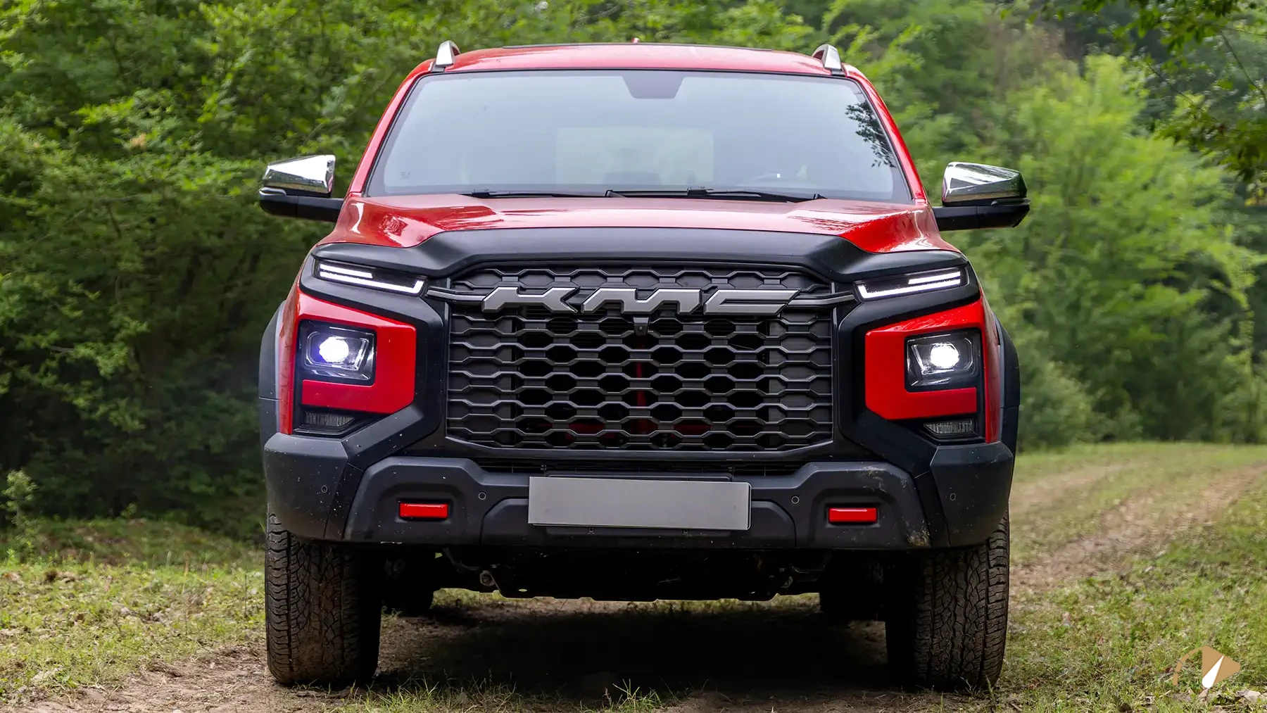 نمای جلو کی ام سی T9 با جلوپنجره بزرگ کرومی و خطوط افقی برجسته، حالتی خشن و عضلانی را القا میکند. چراغهای روشنایی روز بهصورت نواری باریک در بالا قرار گرفتهاند و چراغهای اصلی پایینتر از سطح معمول نصب شدهاند که شباهت زیادی به پیکاپهای آمریکایی نظیر GMC Canyon دارد. سپر جلو حجمپردازی قوی و محافظ زیر موتور نقرهایرنگ دارد.