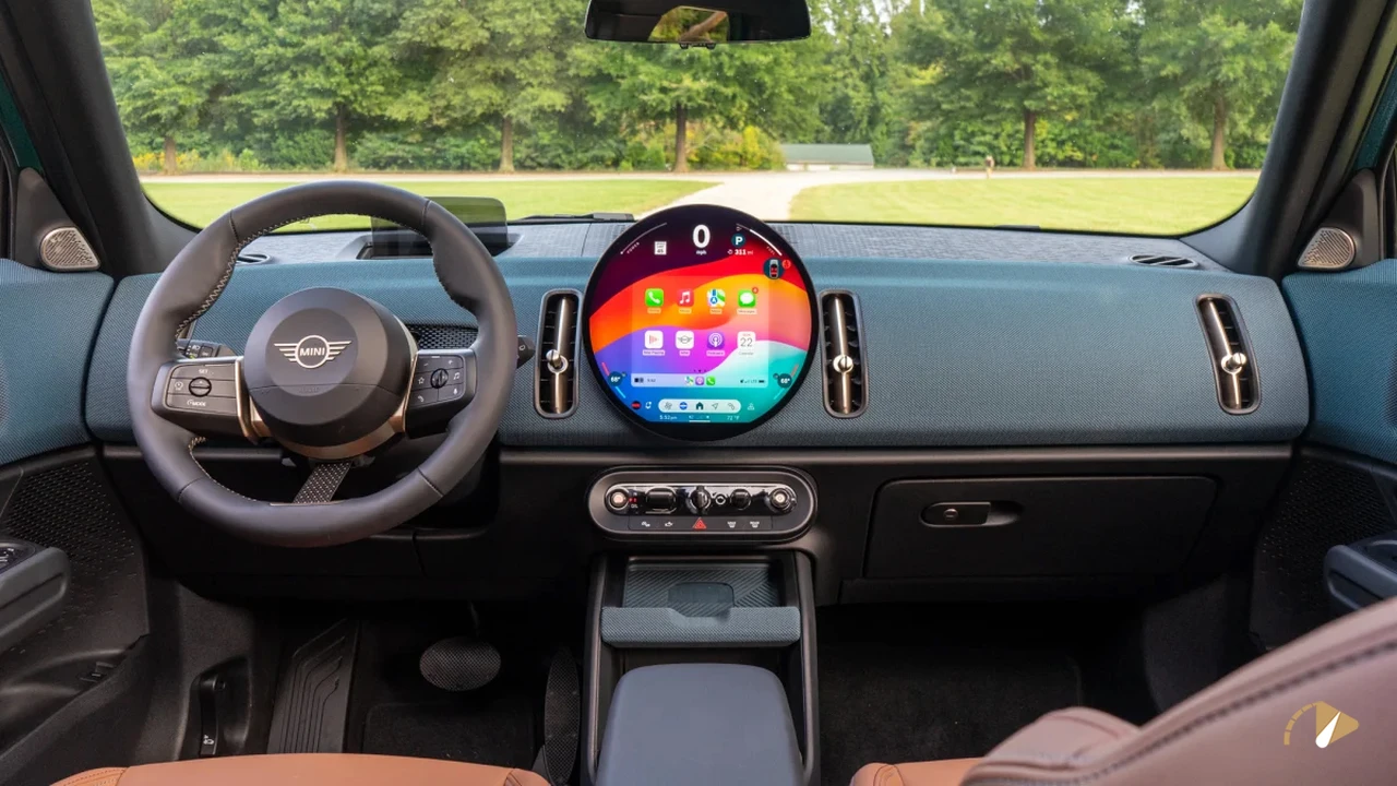 طراحی داخلی مینی کوپر 2025 بر پایه سبک مینیمالیستی بنا شده و عناصر کلاسیک را با فناوریهای روز ترکیب میکند. در مرکز داشبورد، یک نمایشگر دایرهای شکل 9.4 اینچی قرار دارد که نقش پنل دیجیتال و سیستم چندرسانهای را ایفا میکند. این نمایشگر جایگزین نشانگرهای آنالوگ سنتی شده و اطلاعات رانندگی را به صورت دیجیتال نمایش میدهد.