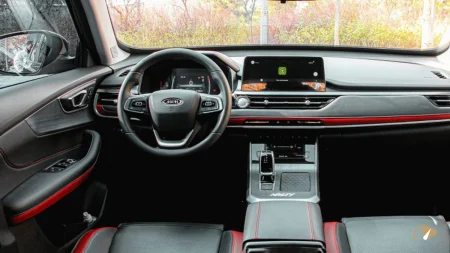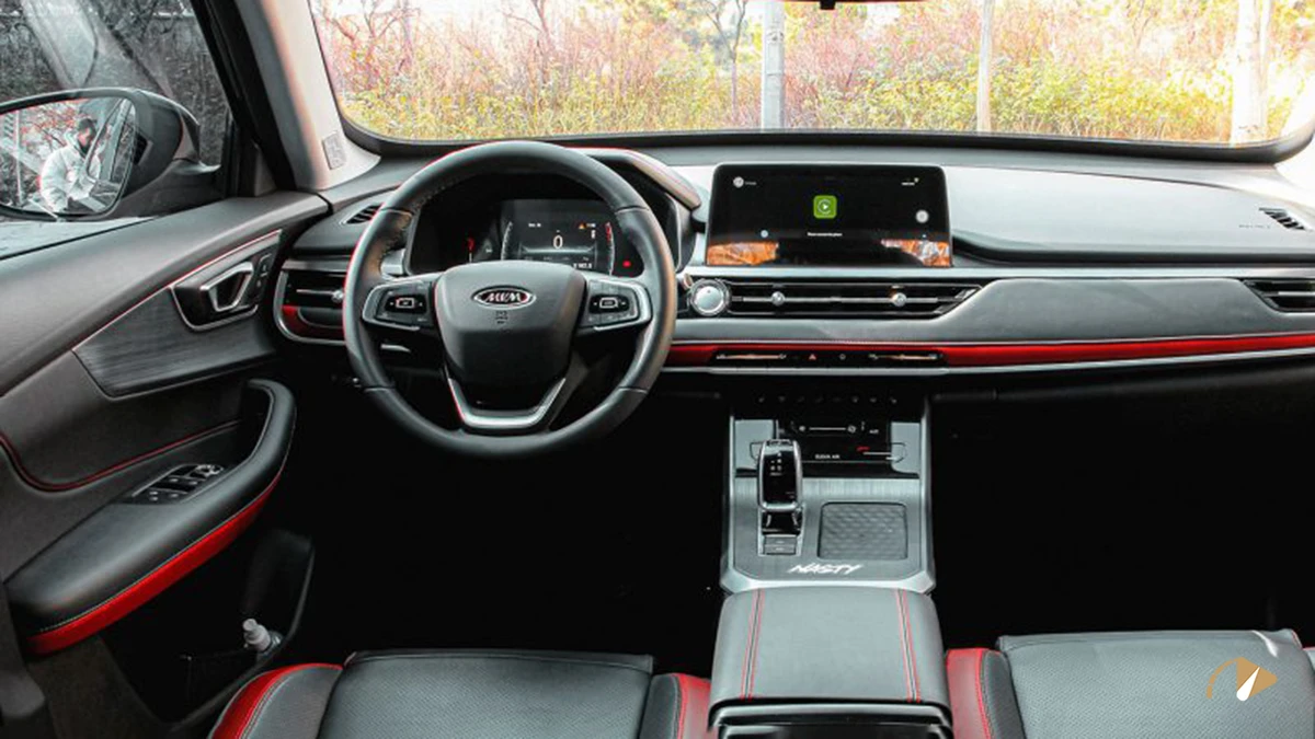 کابین X55 پرو یکی از نقاط قوت اصلی نسبت به مدل قبلی به شمار می‌رود. داشبورد کاملاً بازطراحی شده و با خطوط افقی باریک، نمایشگر لمسی ۱۰.۲۵ اینچی ایستاده و پنل لمسی تهویه مطبوع، ظاهری مدرن و مینیمال ارائه می‌دهد. پشت آمپر دیجیتال ۷ اینچی، اهرم دنده الکترونیکی کوچک و تزیینات قرمز رنگ در داشبورد، رودری‌ها و صندلی‌ها هماهنگی خوبی با ظاهر بیرونی ایجاد کرده‌اند. متریال داشبورد و رودری‌ها نرم و قابل قبول است، هرچند در بخش‌های پایین‌تر از پلاستیک خشک استفاده شده است. فضای ردیف عقب برای دو نفر بزرگسال قابل تحمل است اما جای پای محدودی دارد؛ سقف بلند تا حدی این کمبود را جبران می‌کند. حجم صندوق عقب در حالت عادی حدود ۳۵۰ تا ۴۰۰ لیتر برآورد می‌شود که برای استفاده روزمره کافی اما نه ایده‌آل است.