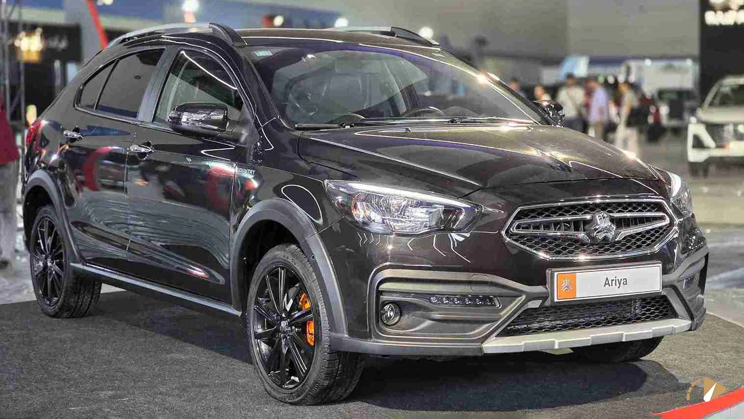 آریا از نظر ظاهری شباهت زیادی به شاهین دارد، اما با ارتفاع بیشتر از زمین، فلاپهای پلاستیکی مشکی در اطراف گلگیرها و روفرک، حالتی کراساوور به خود گرفته است. نمای جلو با چراغهای کشیده LED، جلوپنجره بزرگ و تزئینات کرومی مات، چهرهای نسبتاً مدرن و جوانپسند ایجاد کرده است. در نمای جانبی، رینگهای ۱۷ اینچی آلومینیومی و لاستیکهای ۲۰۵/۵۰R17 تعادل بصری مناسبی به خودرو بخشیدهاند.