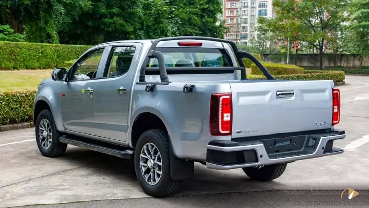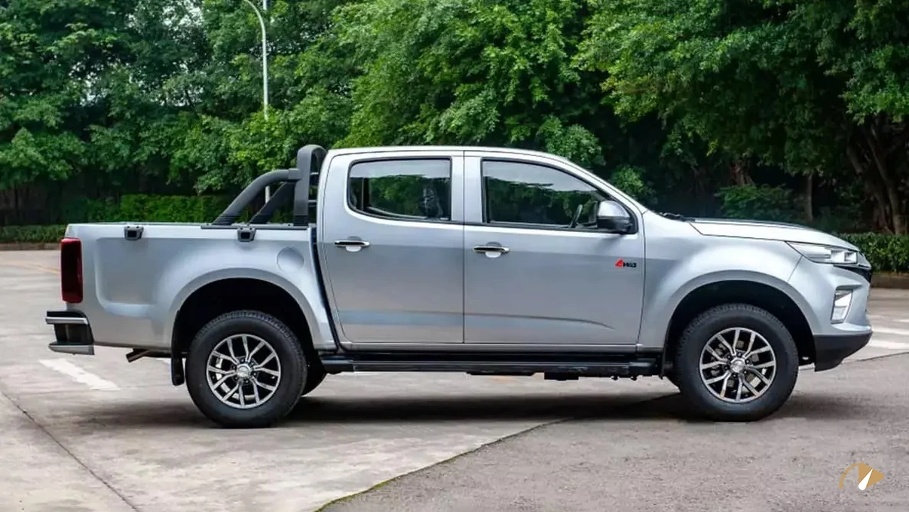 در نمای جانبی، خطوط صاف و رینگ‌های ۱۷ اینچی آلومینیومی با تایرهای ۲۴۵/۷۰، تعادل مناسبی بین سادگی و جذابیت ایجاد کرده‌اند. ارتفاع مناسب از زمین و رکاب‌های جانبی ضدلغزش، قابلیت آفرود را برجسته می‌کنند. نمای عقب نیز با چراغ‌های افقی LED و سپر یکپارچه، دسترسی آسان به فضای بار را فراهم می‌آورد. ابعاد کلی خودرو در نسخه لانگ شامل طول ۵۶۹۲ میلی‌متر، عرض ۱۸۸۵ میلی‌متر و ارتفاع ۱۸۳۰ میلی‌متر است که فاصله محوری ۳۴۰۶ میلی‌متری آن، پایداری خوبی در جاده‌های ناهموار تضمین می‌کند. بدنه مقاوم با ظرفیت باربری حدود ۸۰۰ کیلوگرم، این پیکاپ را برای مصارف کاری و تفریحی ایده‌آل می‌سازد.